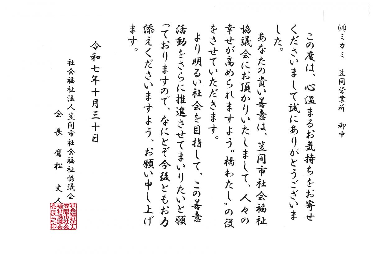 【社会福祉法人 笠間市社会福祉協議会からの感謝状】